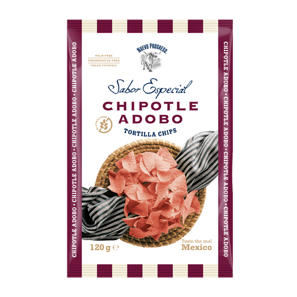Chipotle Adobo -mausteella maustetut gluteenittomat Nuevo Progreso -maissilastut sopivat niin meksikolaisen ruoan lisukkeeksi kuin snacksina.