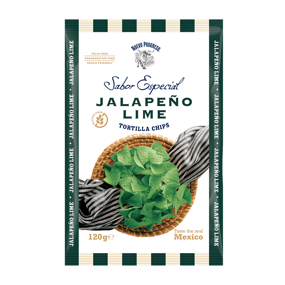 Jalapeño-chilillä maustetut gluteenittomat Nuevo Progreso -maissilastut sopivat niin meksikolaisen ruoan lisukkeeksi kuin snacksina.